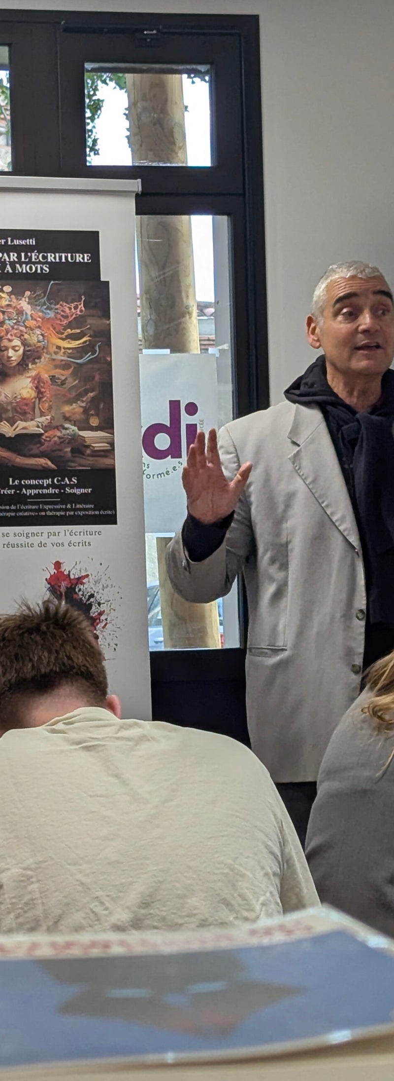 Olivier Lusetti : Concept C.A.S. Rencontre Création Littéraire Jeunesse. Passionné par la démocratisation de l'acte d'écrire et l'apprentissage de l'allègement des maux par le poids des mots, Olivier Lusetti s'engage à partager sa plume pour un avenir en partage. Son approche 'Se soigner Maux à mots' se traduit concrètement par des projets pédagogiques proposés aux établissements scolaires via les EAC du PassCulture. L'expérience marquante d'un travail de cinq mois avec 230 élèves du lycée Notre-Dame de Bon Secours a profondément influencé sa vision de la littérature jeunesse, qu'il résume par 'La rigidité du cadre et la liberté du tableau'.